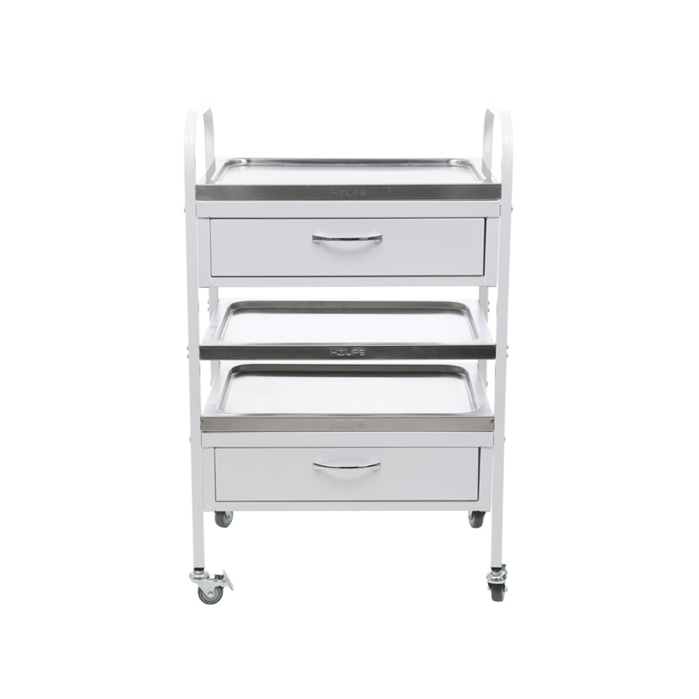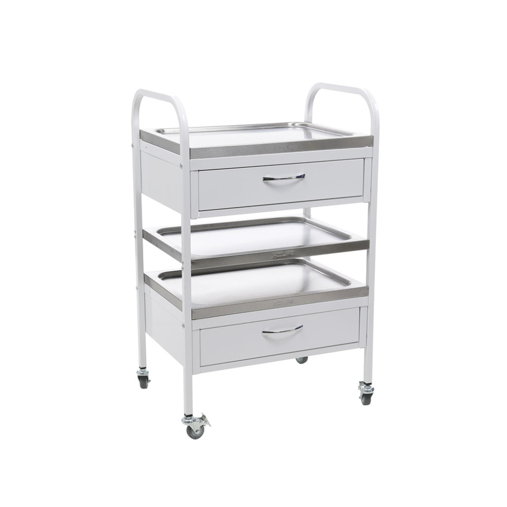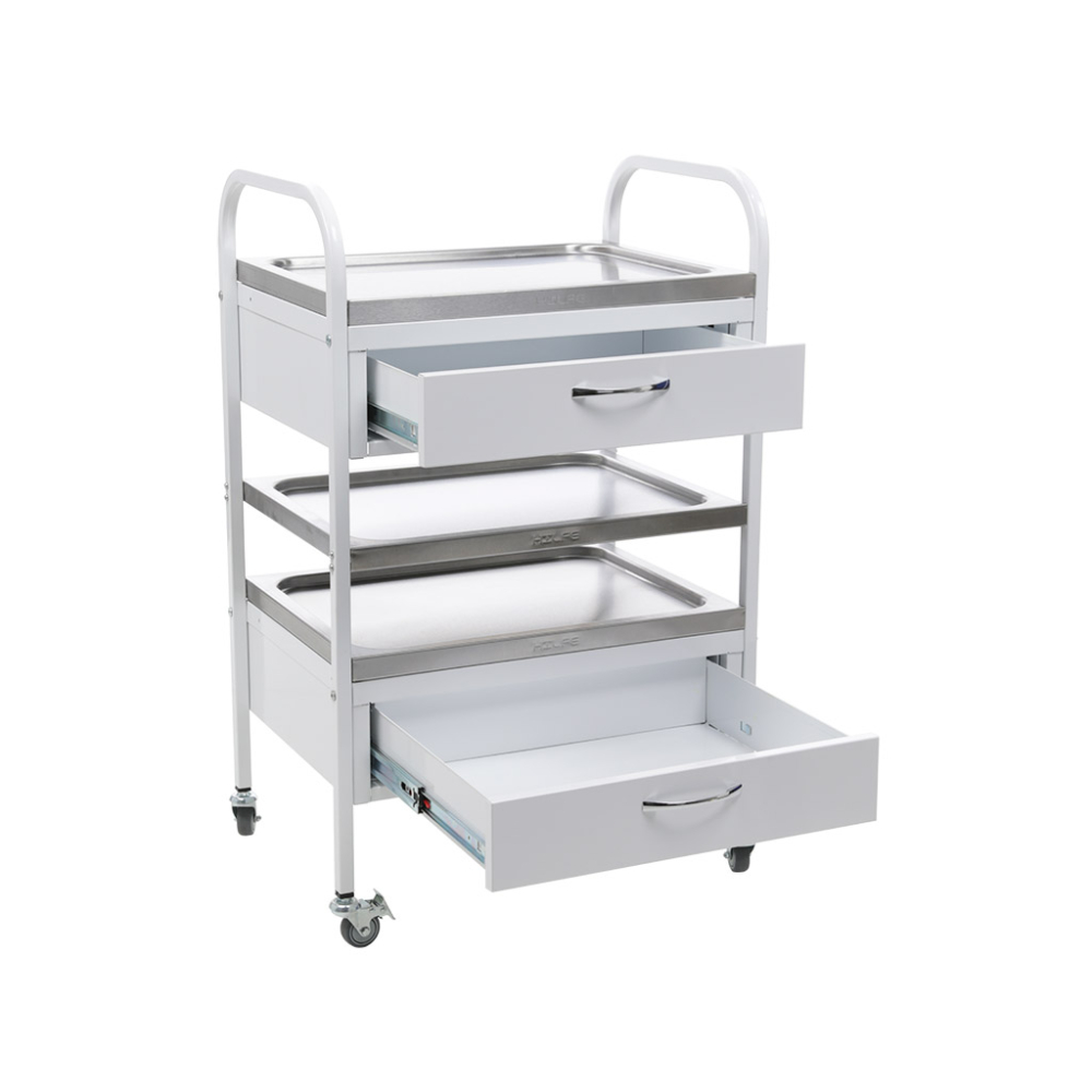 Стол манипуляционный MD SM 2 предназначен для размещения и перевозки медицинских препаратов, инструментов и прочих предметов в пределах медучреждения. Боковые стойки выполнены из стальной профильной трубы и имеют дугообразную форму. Дуги стоек выполняют одновременно функцию ручек. Ножки оснащены колесными опорами, на двух установлен стояночный тормоз. Стол оборудован тремя полками из нержавеющей стали, и двумя выдвижными ящиками с телескопическими направляющими. Большой ассортимент металлической мебели и сейфов представлен в интернет-магазине SAFE-STR.RU. У нас всегда цены ниже, чем у конкурентов. Офисы магазина работают в Москве и Санкт-Петербурге. Доставка заказов осуществляется по Московской и Ленинградской областям.